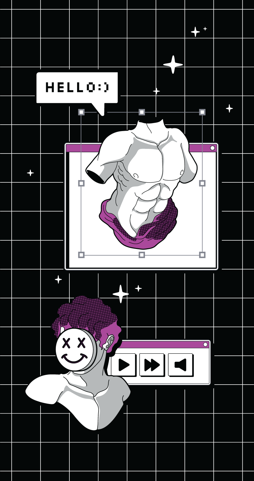 Introducing "Digital Greek Fusion" - a mesmerizing Y2K-style illustration for sale, featuring the torso of a Greek statue. This captivating artwork merges classical elegance with futuristic computer graphics. With vibrant colors and intricate details, it adds intrigue to any space or digital project. Own this unique blend of ancient and modern aesthetics today.